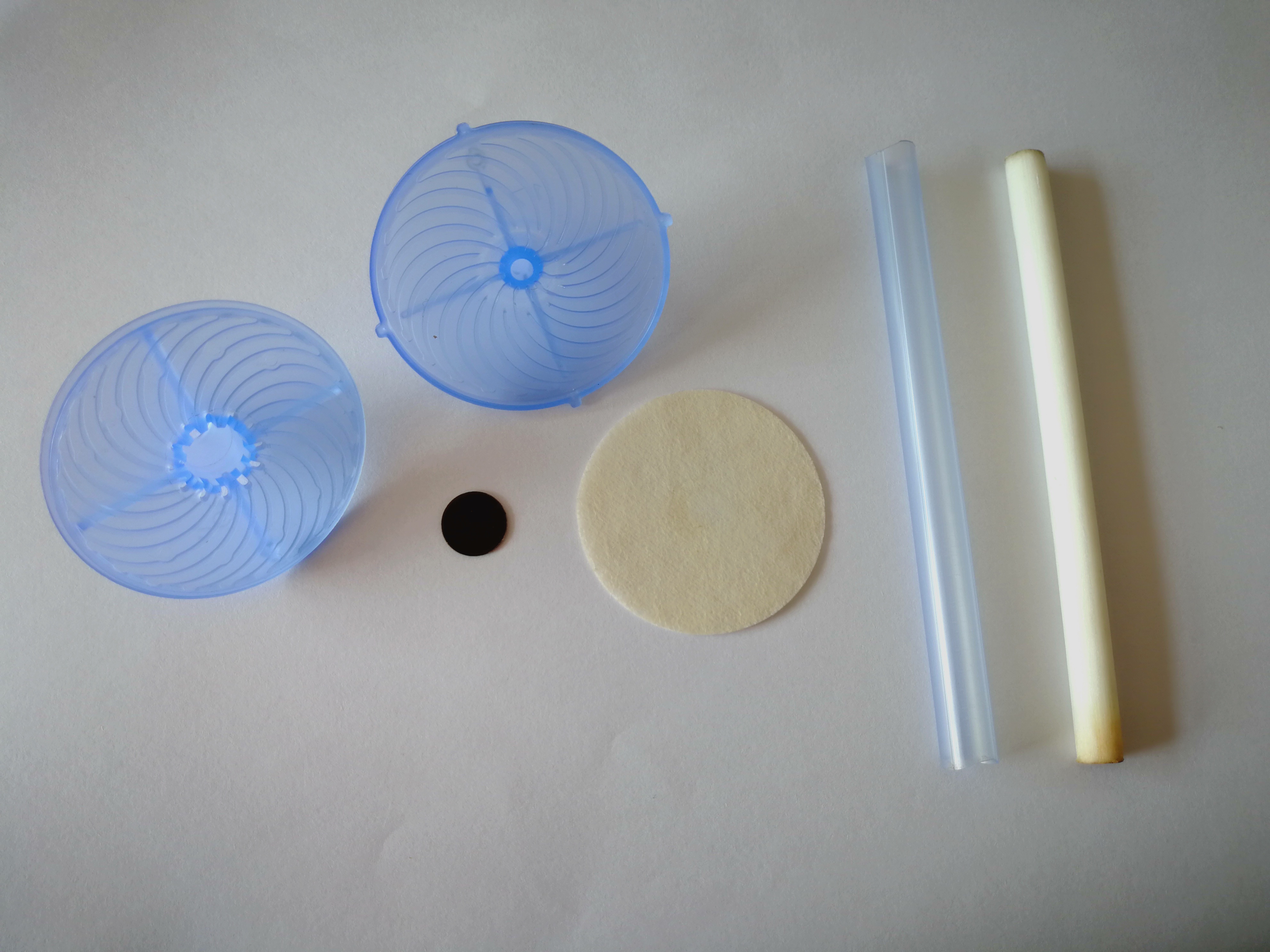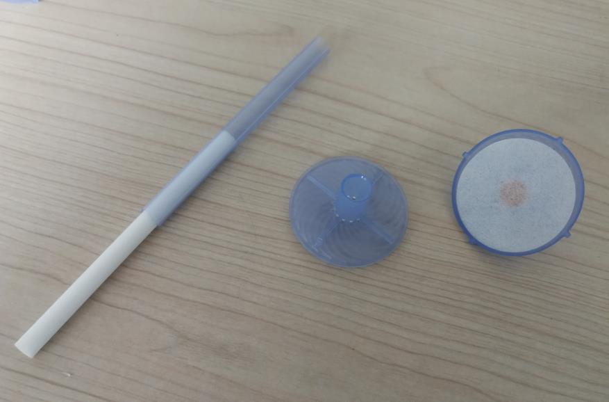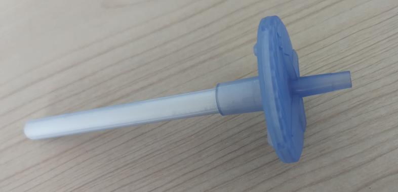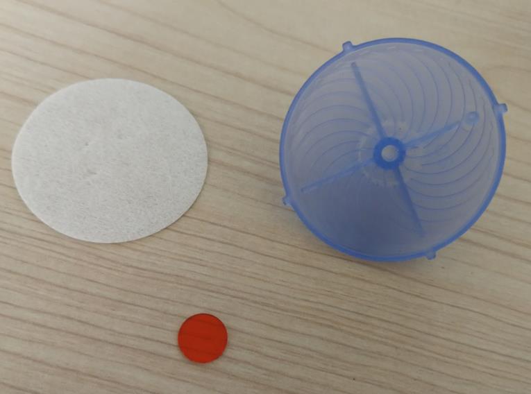 本項目共完成6個零件的自動裝配,其中有2個注塑件上傘蓋下傘蓋,一PVC片直徑11.5mm厚0.9mm名稱分流片,一直徑40mm無紡布片名稱濕化體,一段導水殼一段導水芯。自動裝配過程:轉盤式多工位方式,涉及到兩個塑料料扣合,導水芯導水殼插裝,濕化體模切後自動就位。
